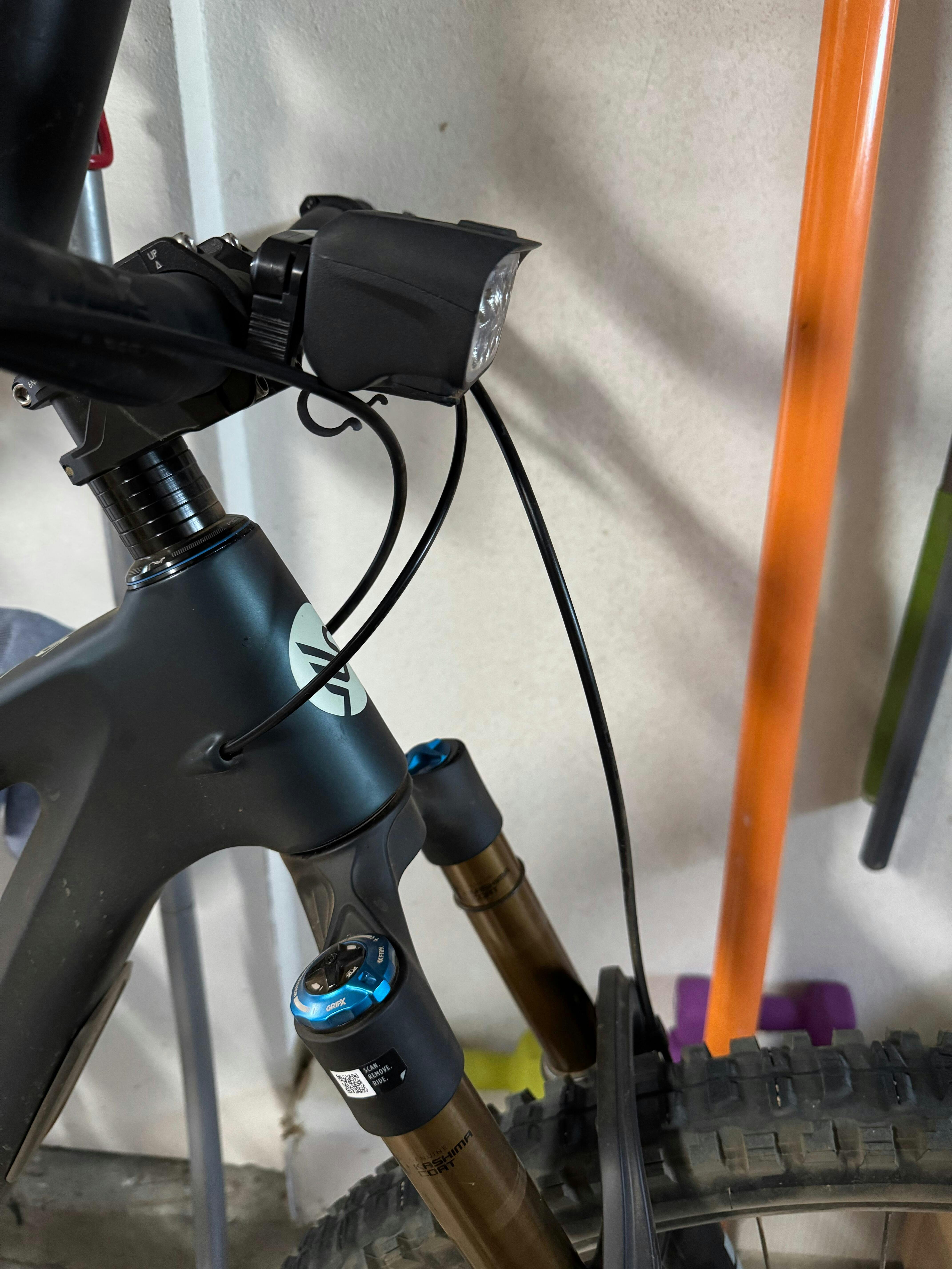 Clever little part that helps keep brake cables and other items out of the way, preventing distracting shadows on the trail as you ride. Simple attachment to the bottom of the Trail Evo.